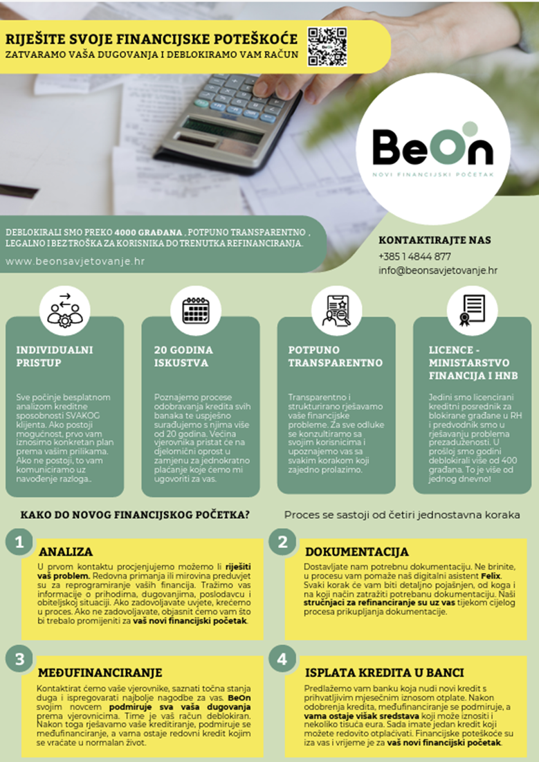 Tvrtka BEON savjetovanje d.o.o., specijalizirana je za pomoć građanima u financijskim poteškoćama, reprogramiranju dugova i pronalasku održivih rješenja za blokade, ovrhe i druga financijska opterećenja.